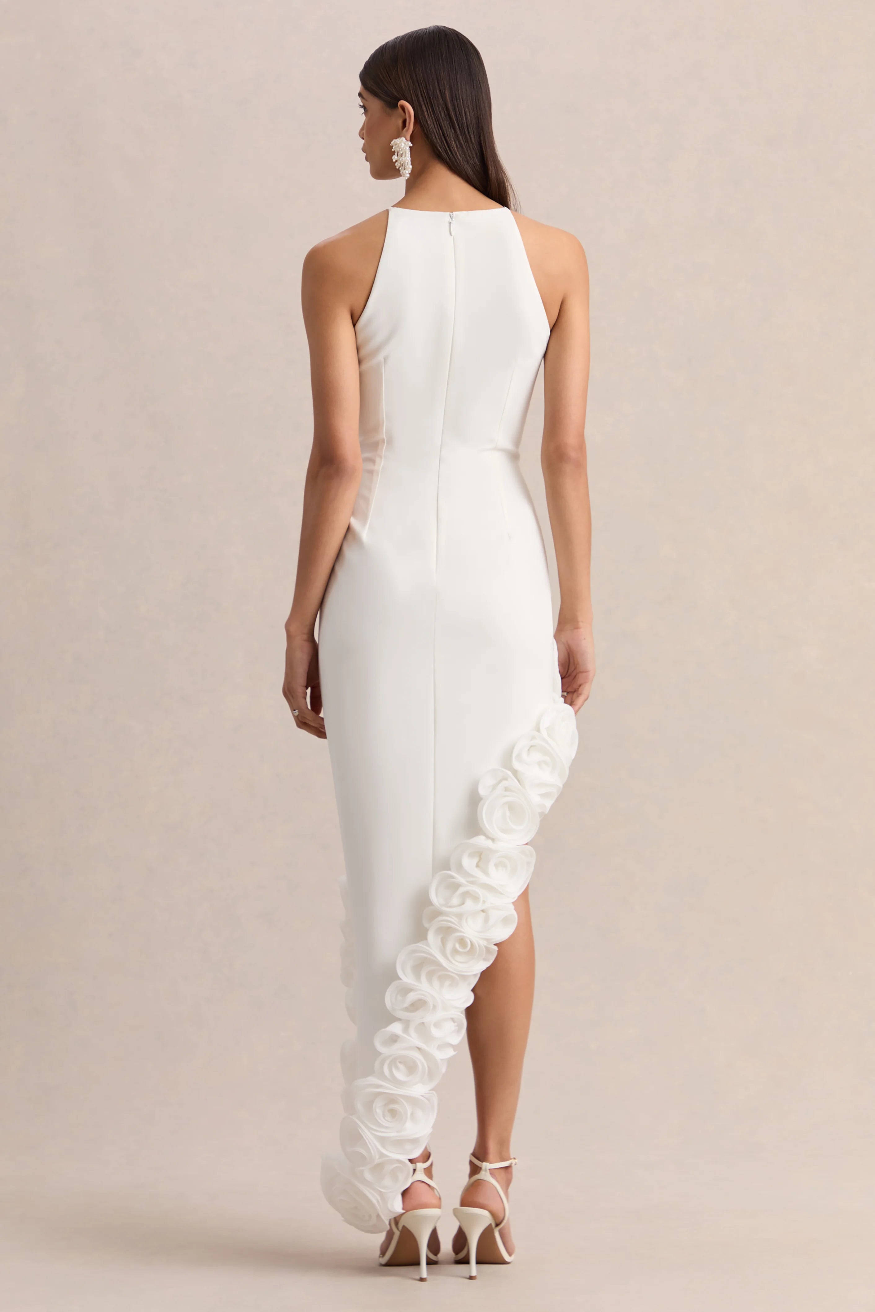 Indira embodies modern elegance with a sculptural, feminine finish. Crafted from our premium white brushed jersey in a flowing maxi length, this design offers a refined and contemporary silhouette. Featuring a halter neckline and an asymmetric floral hem, Indira is designed for moments that call for striking sophistication and effortless grace.