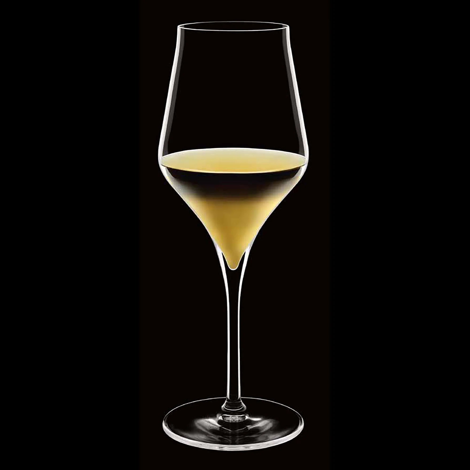 The white wine glasses of the Supremo range have been designed by Bormioli Luigi’s designers in collaboration with Centro Studi Assaggiatori (the international specialists of the wine sensorial analysis). The white wine glasses are produced in machine blown SON.hyx crystal glass and with a new process making them lighter and thinner while maintaining their strength. The bowl shapes are innovative and elegant and have unique sensorial perceptions: emphasizing the wine’s aromas during their development in the bowl while lessening the alcoholic element. In this way the wine’s aromas and flavors develop pleasantly in the bowl. After 10 minutes, all wines contained in a Supremo white wine glasses lose the alcoholic aroma elements while the wine’s specific aromatic characteristics are enhanced to the fullest. The white wine glasses design is suitable for specific wine varietals. The chimney balances the wine aromas with a low alcoholic content and its cylindrical shape directs the wine to the center of the tongue. The conical shape condenses the alcoholic vapors so that in the aromatic chamber only the wine aromas will develop. The smooth connection between the conical and convex shape avoids the breakage of the aromatic molecules during the wine swirling process. The Convex surface enables a high wine oxidation on the surface with a low oxidation underneath, retaining the most delicate aromas and facilitating their pleasant development. Epicure (indentation) at the base of the bowl, shows the real wine color reflection. Permanent ultra break-resistant stem (Titanium reinforced).