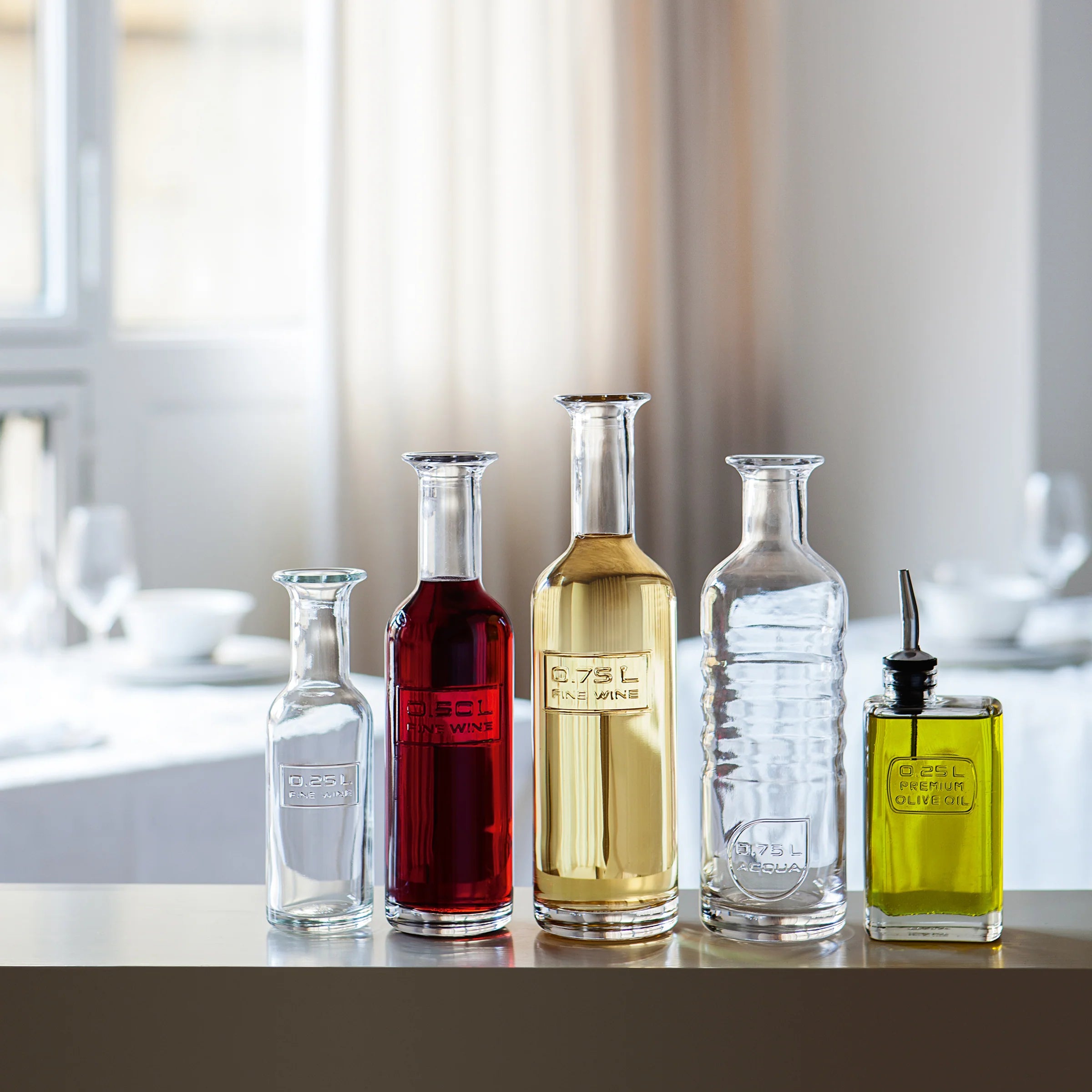 The Optima collection was created especially for specific serving and storage bottles, it offers a wide range of storage solution for various liquids and other contents. The collection consists of bottles for water, fine wine, oils, bitters, juice, milk, vinegar and other liquids. All bottles have a safe edge rim, they are easy to fill and easy to pour and thanks to a registered design those bottles add value to the specific content enhancing the perceived quality. The wine bottles are with gauge marks of 1 L, 0.75 L, 0.50 L and 0.25 L. since those are reusable over time they are eco-friendly.