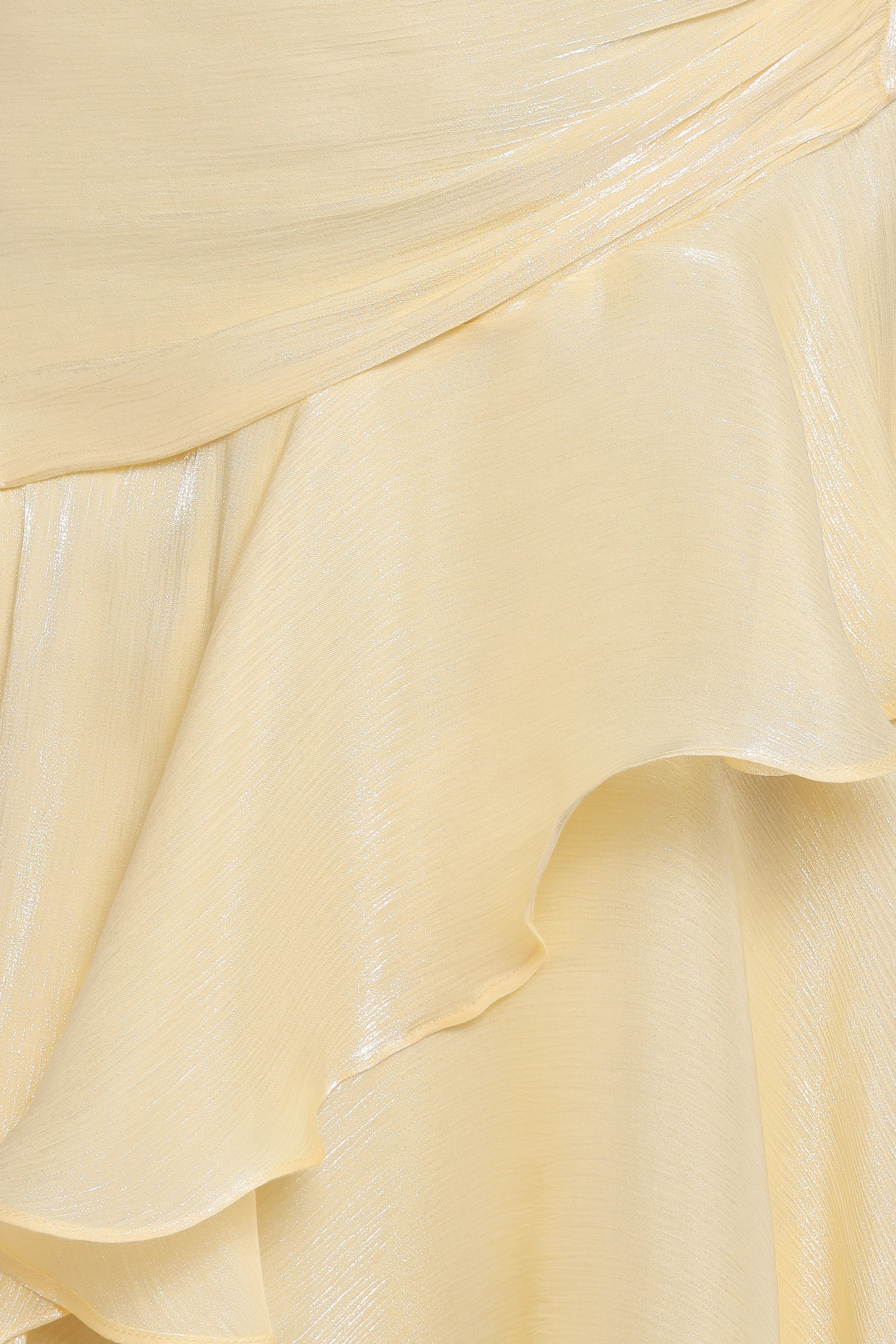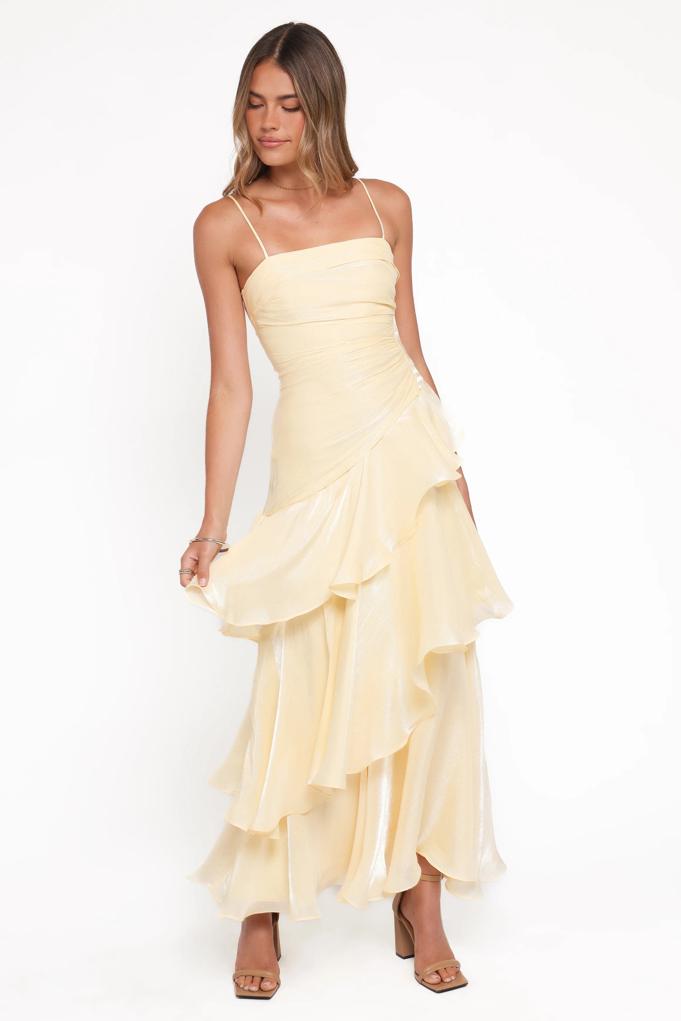 Step into the spotlight with the Rosalie Maxi Dress in a stunning butter-yellow hue. This dress is designed to create an unforgettable silhouette, featuring a chic square neckline and a beautifully gathered ruched detail that accentuates your shape.