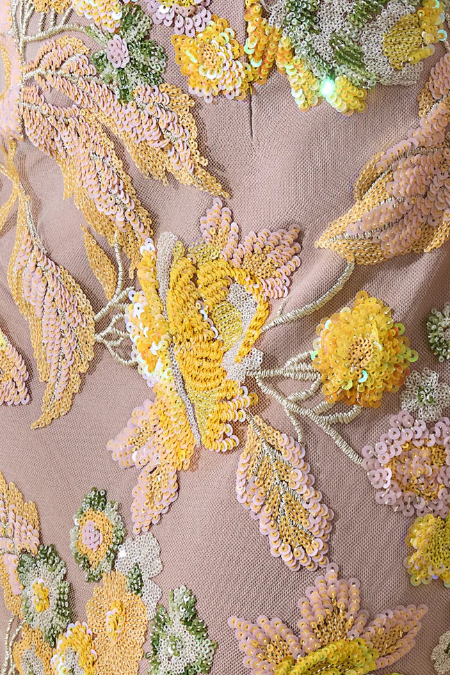 Severn radiates bold elegance with a silhouette that captivates at every angle. Falling to a sleek maxi length and crafted from our premium yellow embellished fabric, it glides over the body with a luminous, figure-flattering finish. The bandeau neckline highlights the shoulders with effortless sophistication, while the centre back split adds a subtle touch of drama and movement. Severn is designed for moments that call for radiant, unforgettable glamour.