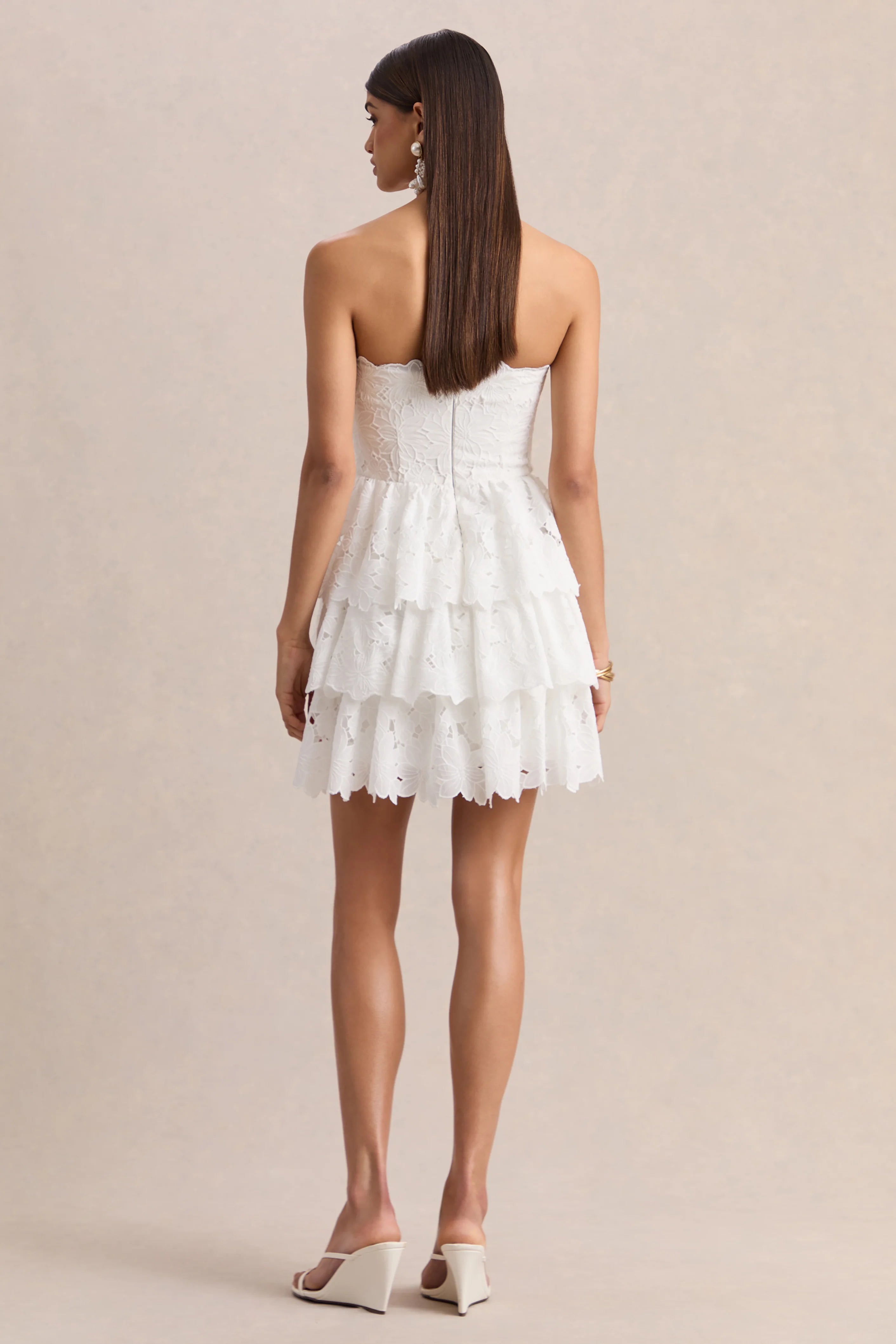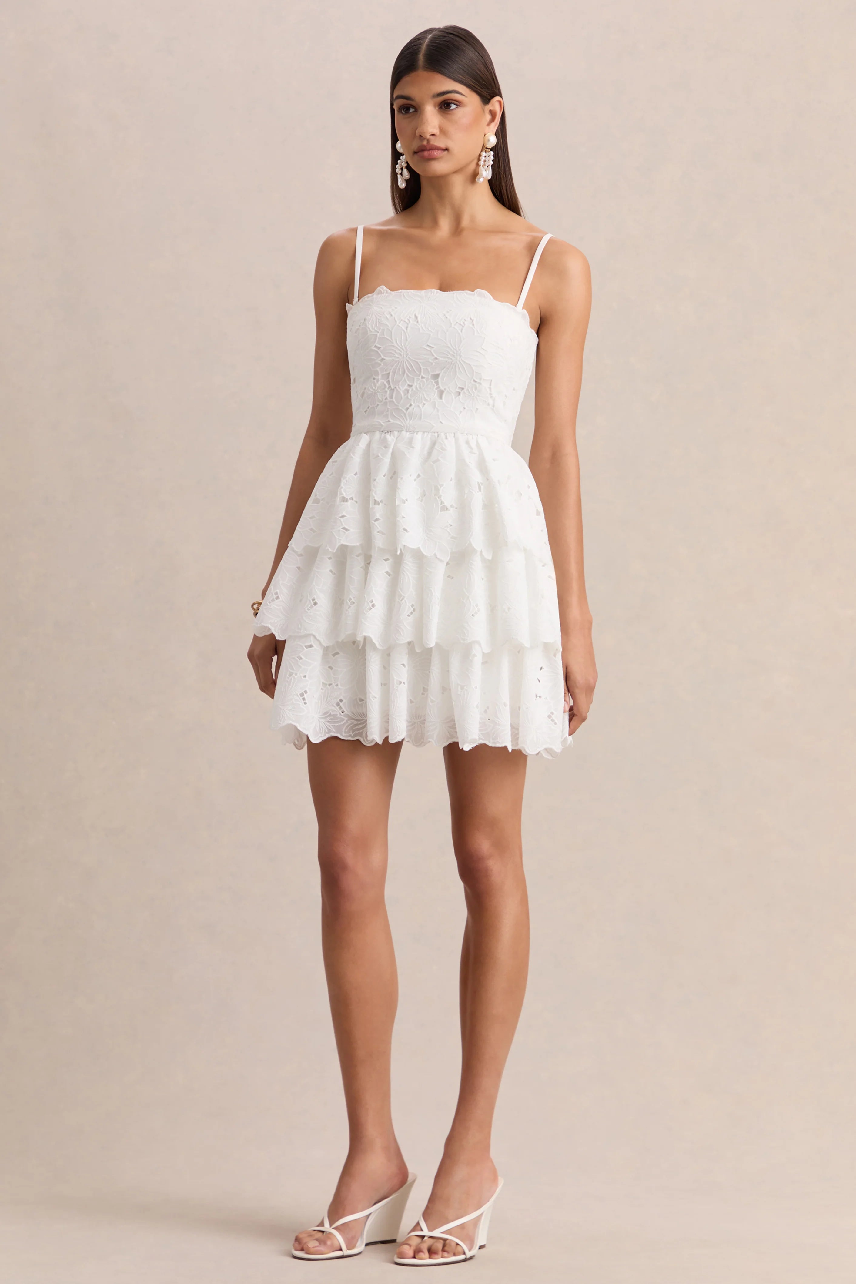 Your next must have this season, Winona has arrived. Crafted from our premium lace in classic white hue, this mini dress embodies effortless romance with every detail. The square neckline elegantly frames the décolletage, while layered ruffled hemline adds volume and movement to the silhouette. Winona is the perfect choice, from summer getaways to garden parties.